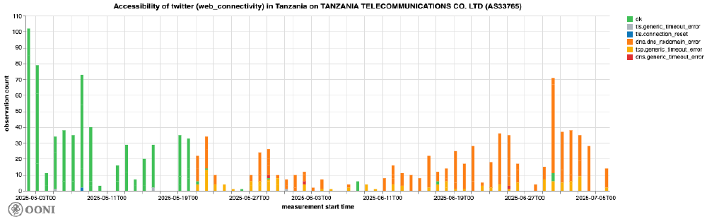 Chart: OONI Probe testing of twitter.com and x.com on Tanzania Telecommunications Co. Ltd (AS33765) between 1st May 2025 to 7th July 2025 (source: OONI data).